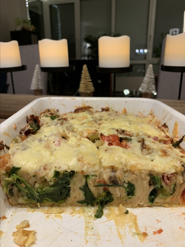 Im vorgeheizten Ofen ca. 30 Minuten backen. Den restlichen Käse darüber streuen. Nochmal schmelzen lassen.