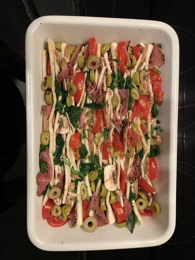 Salamischeiben, Spinatblättern, Tomaten, Pilze, Oliven zwischen die Wrapfächer stecken.