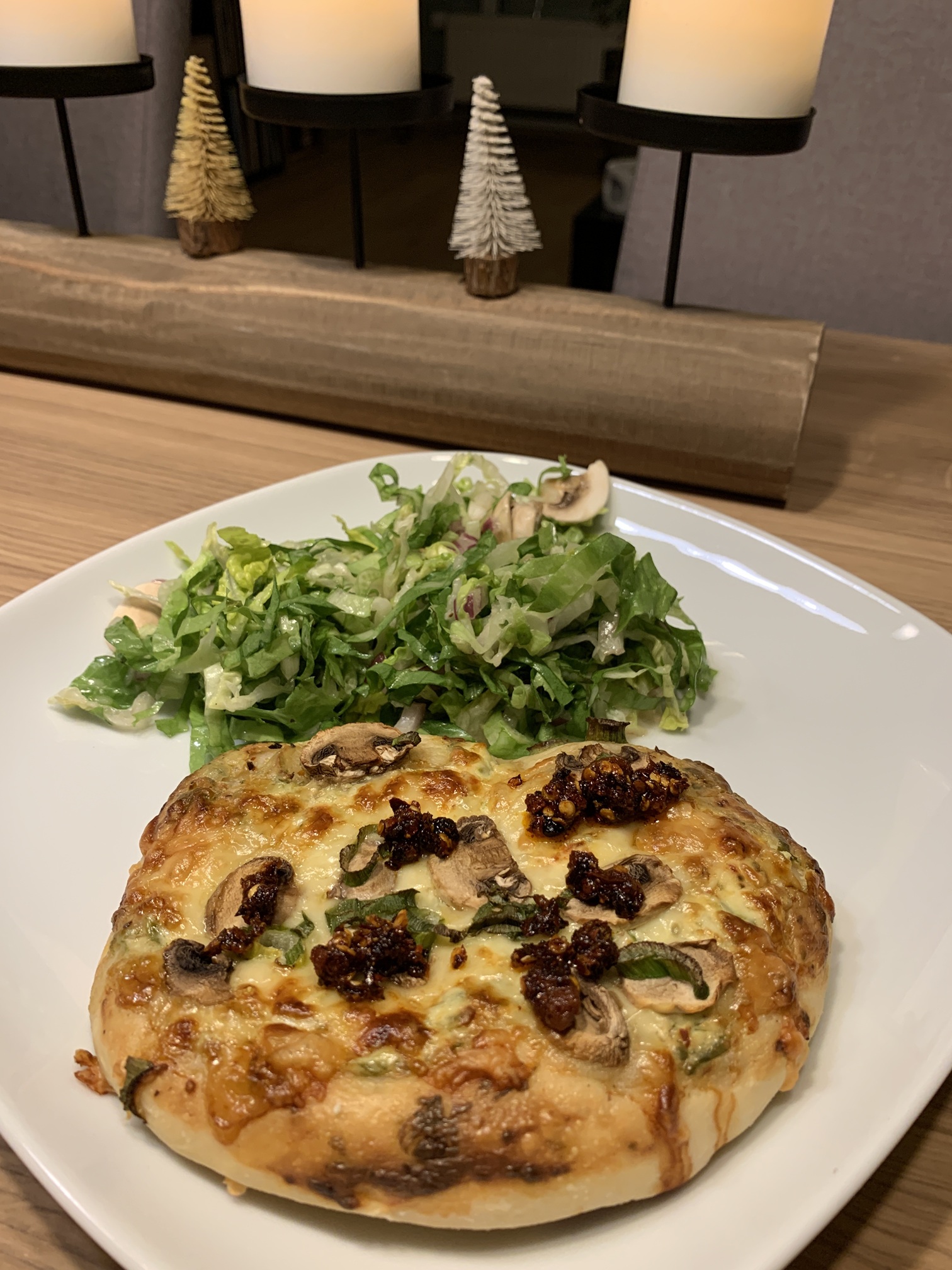 Jetzt die Fladen mit Creme Fraiche bestreichen und mit Kräuter und Gewürze würzen. Ger. Käse drauf. Pilze und Frühlingszwiebel klein geschnitten drauf. belegen und im Backofen backen.